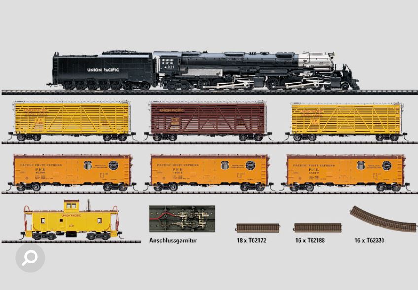 Reihe 4000 “Big Boy” (UP) 模型:Era III 機車和車輛。 機車車架、鍋爐和補水車均由金屬製成。 該機車配有音效電路的 DCC 解碼器和內建 12 條 R3 曲線軌道。 1 套饋線。 原型:聯合太平洋鐵路 (UP) 4000 級「大男孩」。 車輛:1輛CA-3型守車及3輛S-40-12型牲畜車