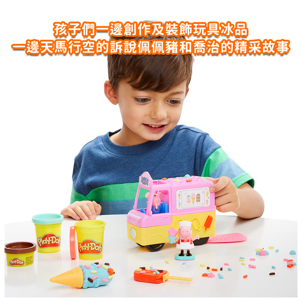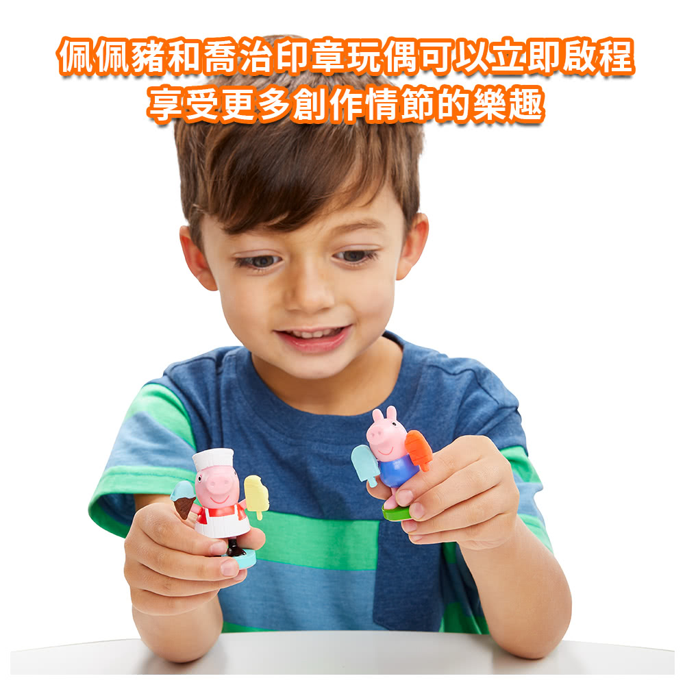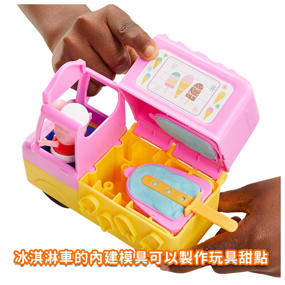 1)粉紅豬小妹與喬治利用冰淇淋車上製作糖果和糖漿,DIY製作冰淇淋蛋筒、冰棒和泰迪熊零食。