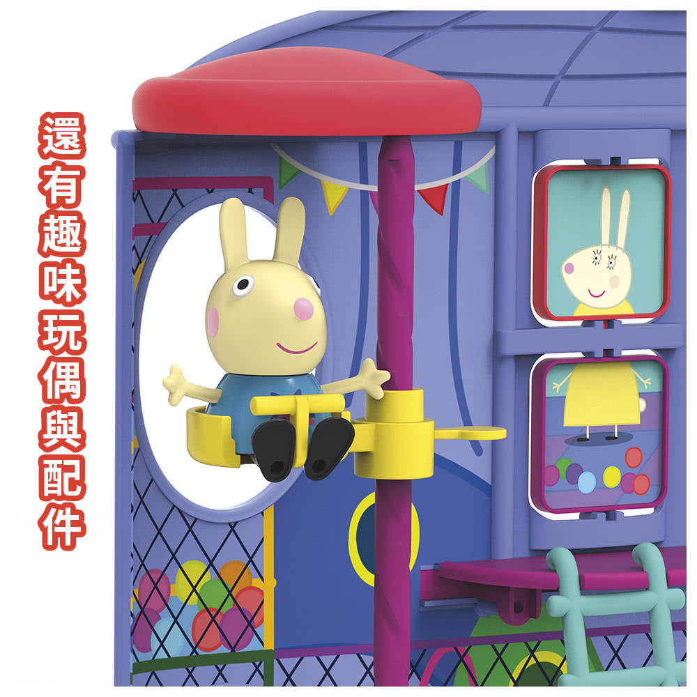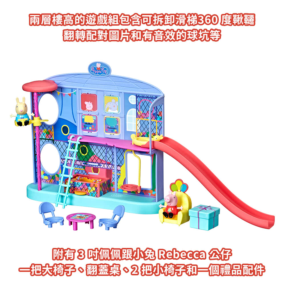 2)附有 3 吋佩佩跟小兔 Rebecca 公仔、一把大椅子(當公仔放在上面時會彈出氣球)、一張翻蓋桌、2 把小椅子和一個禮品配件。