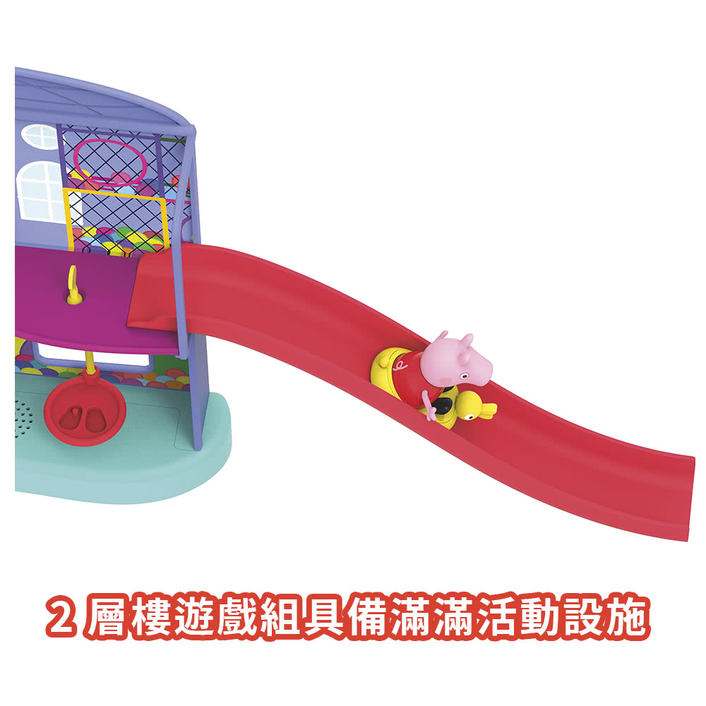 1)兩層樓高的遊戲組包含可拆卸滑梯、360 度鞦韆、翻轉配對圖片和有音效的球坑等。